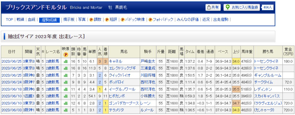 ブリックスアンドモルタル産駒は2023年6月で2勝。社台ファームが力を入れているだけに、勝てる産駒をしっかりと送り出してきた。2勝を挙げた産駒はいずれも逃げており、他の産駒も総じて先行している。前向きな気性でスピードの持続力に長けており、テンから動いてポジションを取れることが強み、というのが現時点での印象。あがり33秒台の脚を使うことはできず、キレ味勝負では分が悪いので、自ら展開を作るようなレースが得意なタイプが多くなるのではないか。
